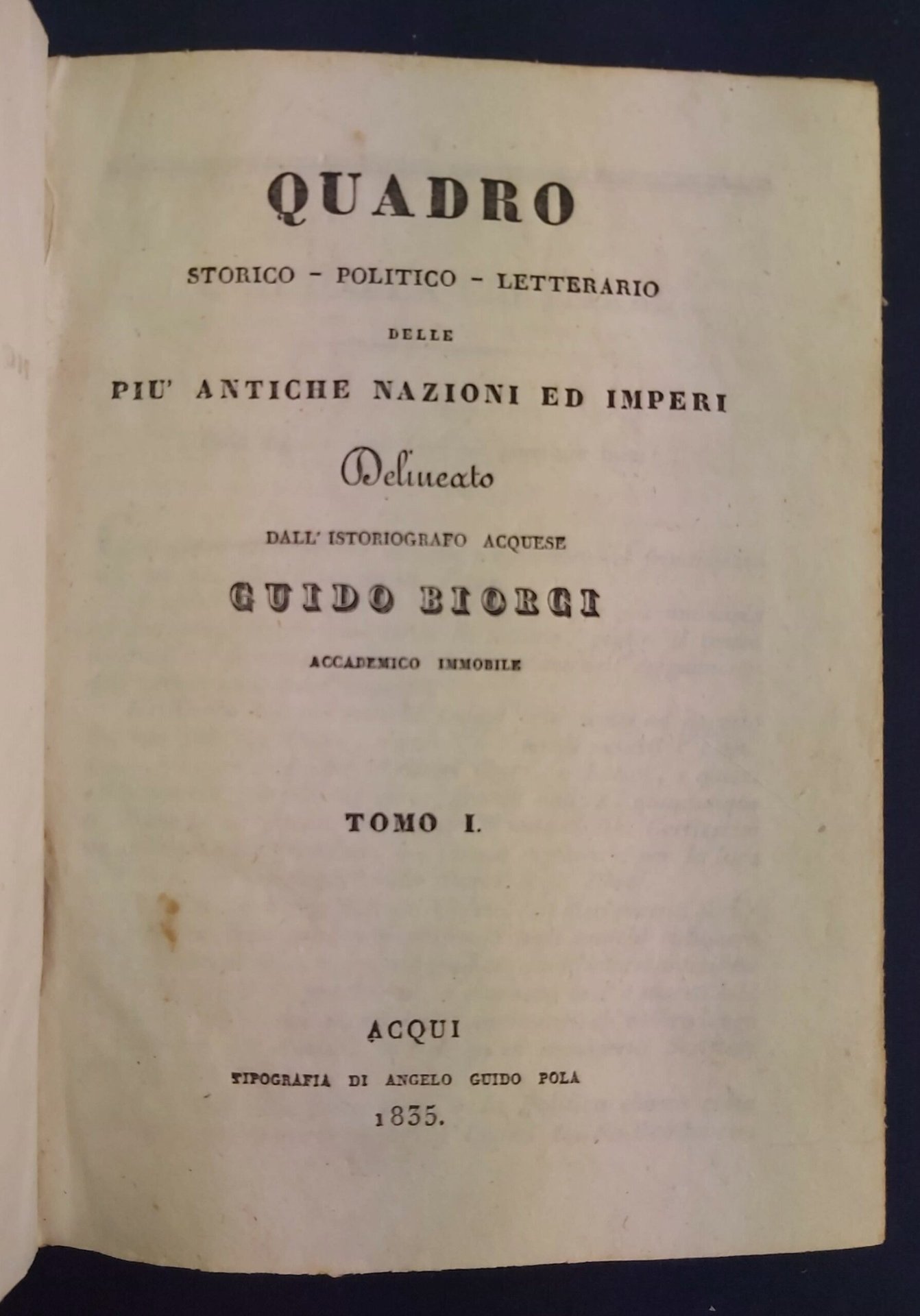 QUADRO STORICO - POLITICO - LETTERARIO delle più antiche nazioni ed imperi delineato dall’istoriografo acquese. Accademico Immobile. Tomo I (e II).