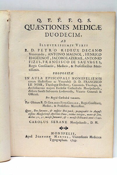 Quaestiones Medicae Duodecim, ab illustrissimis Viris R.D. Petro Rideux Decano Venerando Antonio Magnol, Henrico Haguenot, Jacobo Lazerme, Antonio Fizes, Francisco de Sauvages, Regis Consiliariis, Medicis, et Professoribus meritissimis. Propositae in aula episcopali monspeliensi coram Illustrissimo ac Venerabiliti D.D. Francisco Le Noir, Theologiae Doctore, Canonico, Theologo, et Archidiacono majore Ecclesiae Cathedralis Monspeliensis, Abbate Sacti Salvatoris Lodovensis, Vicario Generali et Officiali.