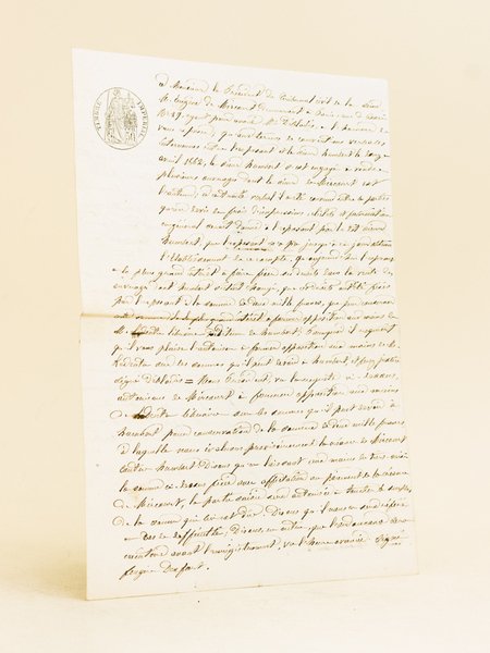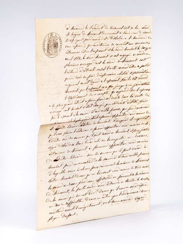 1 feuillet in-8 rédigé recto-verso, 22 avril 1863 Intéressante copie d'acte d'huissier, qui fut remise à l'éditeur Edouard Dentu. Il lui est interdit de régler son confrère Humbert, les sommes devant servir au paiement d'Eugène de Mirecourt. On trouve trace de 3 titres de Charles-Jean-Baptiste Jacquot, dit Eugène de Mirecourt (1812-1880), édité en collaboration entre Dentu et Humbert : "Le Petit-fils de Pigault-Lebrun" (1863), "La bourse et les signes du siècle" (1863) et "La queue de Voltaire" 1864. Bon document témoin de la complexité des relations entretenues par les auteurs et éditeurs tout au long du siècle.