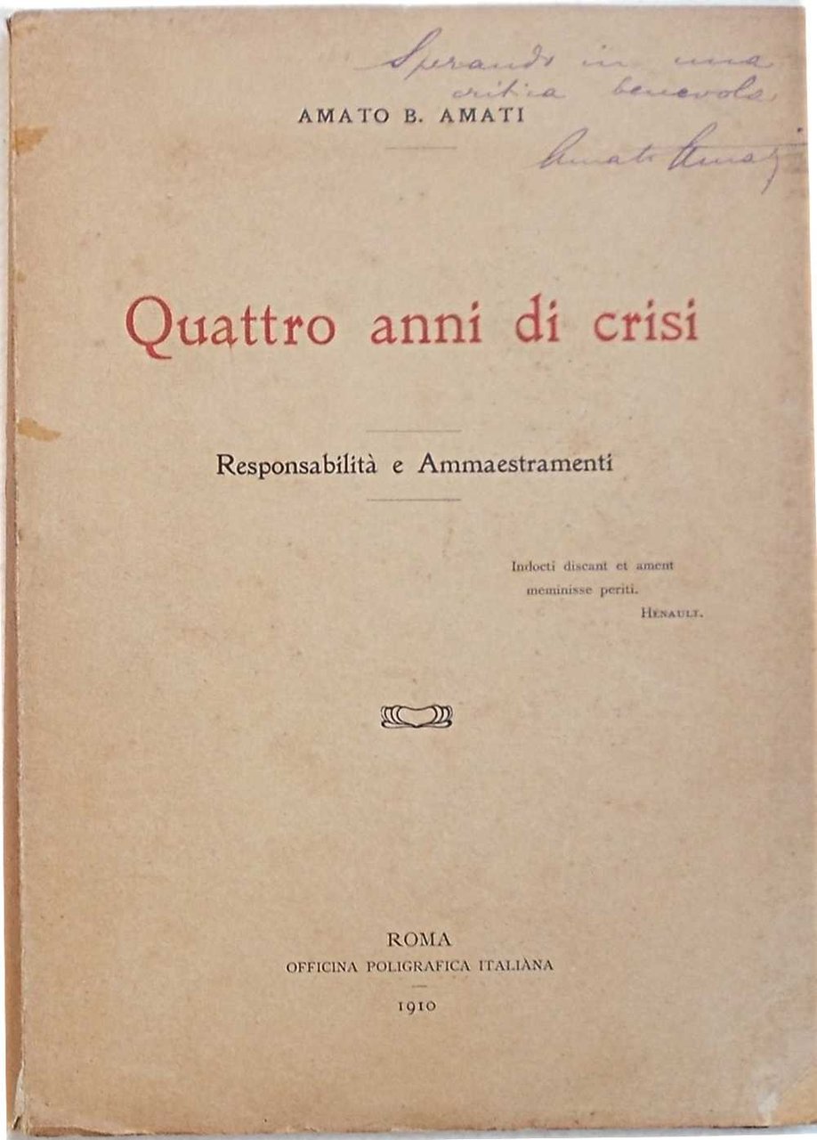 In 8° (cm. 21 x 15,5); pagg. 214; leggera cartonatura originale. VG-. ** Invio autografo dell'Autore in copertina. "Ora che il periodo più acuto della crisi è sorpassato lo studio dei fatti potrà farsi con vantaggio. troppo spesso si pretende di ridurre l'economia alla semplicità della meccanica".