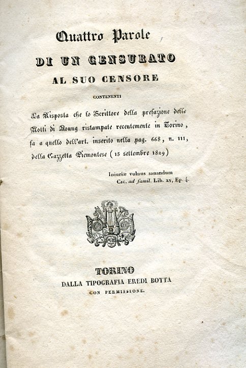 Quattro parole di un censurato al suo censore contenenti la risposta che lo Scrittore della prefazione delle Notti di Young ristampate recentemente in Torino, fa a quello dell'art. inserito nella pag. 668, n. 111, della Gazzetta Piemontese