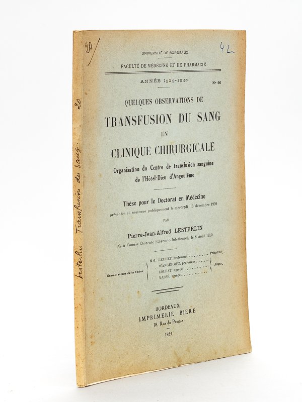 Thèse pour le doctorat en médecine présentée et soutenue publiquement le mercredi 13 décembre 1939, 1 vol. in-8 br., Imprimerie Bière, Bordeaux, 1939, 75 pp. Etat très satisfaisant. Peu courant.