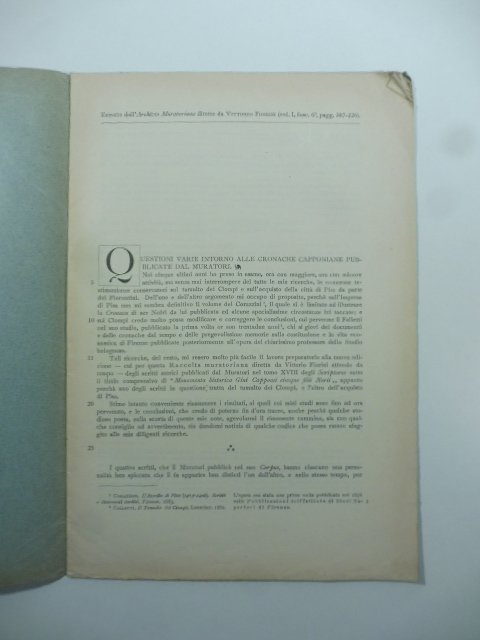 In 4 (cm 21 x 30), pp. 20. Brossura muta coeva con titolo manoscritto al piatto anteriore e omaggio autografo. Estratto editoriale dall'Archivio Muratoriano.