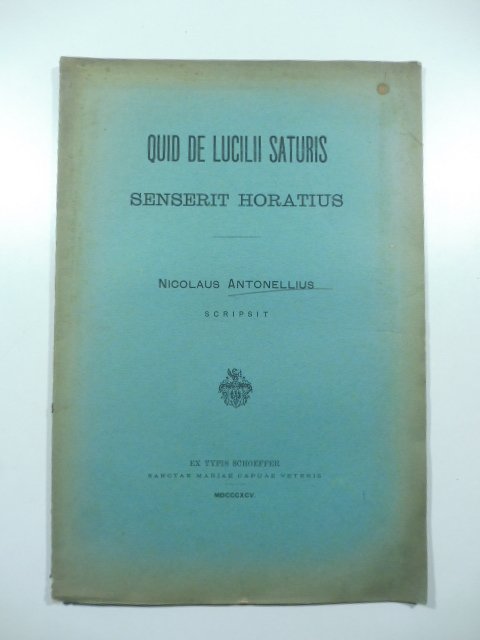 In 8 (cm 17 x 25), pp. 31 + (1b). Brossura editoriale. Saggio in latino stampato a Santa Maria Capua Vetere sulla relazione tra le satire di Lucilio e quelle di Orazio.