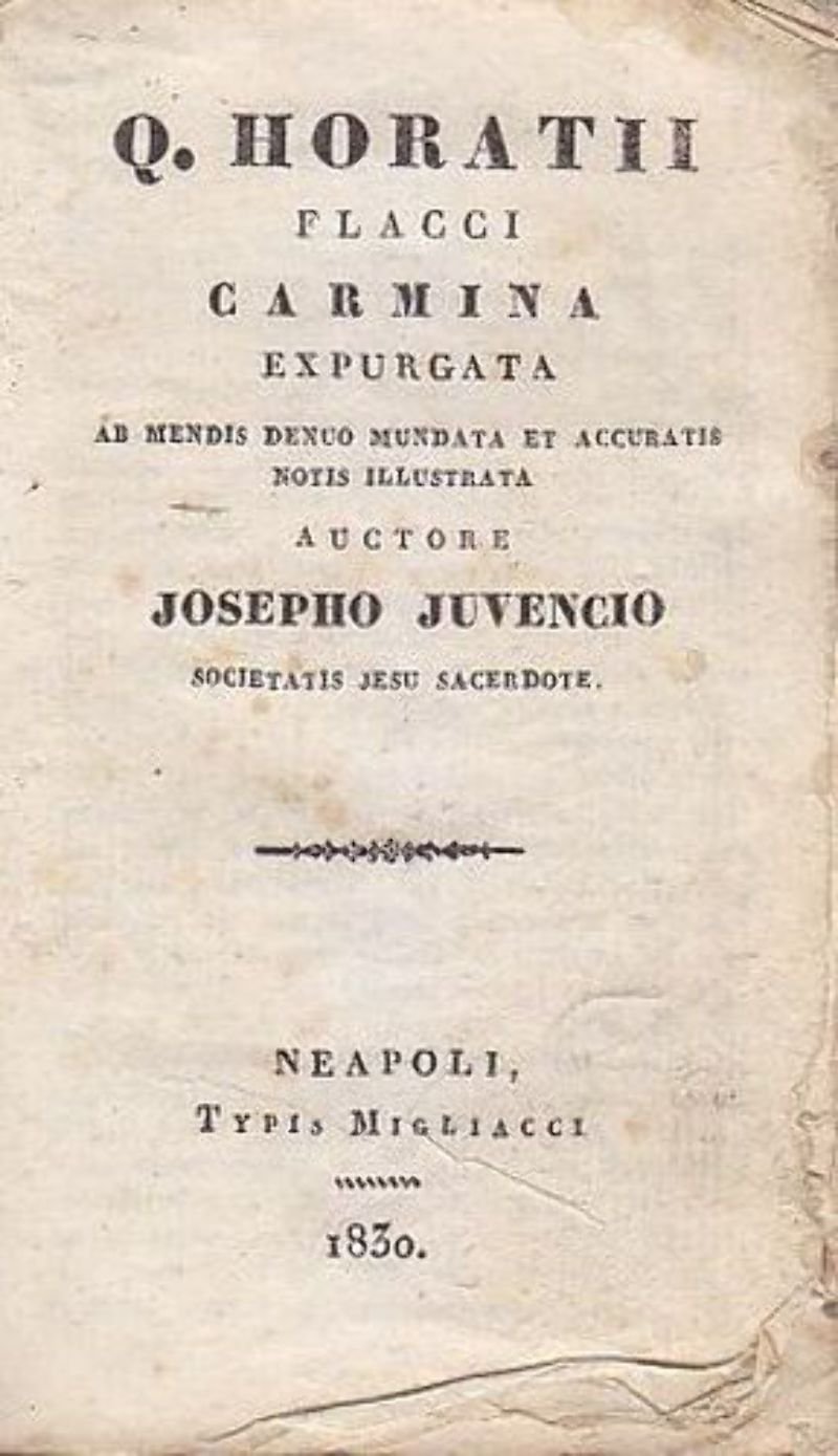 QUINTI HORATII FLACCI CARMINA ESPURGATA ad mendis denuo mundata et accuratis notis illustrata. Neapoli, Typis Migliacci, 1830. XX + 619 pagine. Copertina in tutta pergamena. Dimensioni: 10 x 16 cm. Stato di conservazione: buono (alcune piccole macchie d’inchiostro che coprono in parte il testo in poche pagine, copertina sciupata, fioriture diffuse, mancanze alle sguardie)
