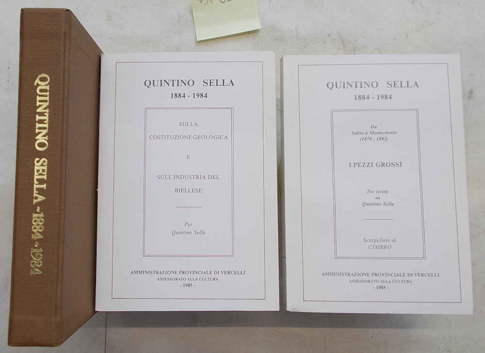 Due volumi in 16° contenuti in astucico in cartonatura con titoli in oro; pagg. LXI, 60 - 18, (86); con 1 carta ripiegata f.t, tavole f.t. e alcune illustrazioni n.t. VG. ** Edizione di 1000 esempl. numerati (questo è il n. 233) nel centenario della morte. Il primo volume contiene una lunga nota introduttiva di A. Sola e la ristampa anastatica di "Sulla costituzione geologica e sull'industria del Biellese"; il secondo una nota introduttiva di Marco Neirotti e la riproduzione di tre scritti di G. Faldella sul Sella contenuti in "La Salita a Montecitorio (1878 - 1882) I pezzi grossi."