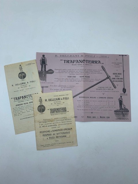 Bifoglio (4 facciate) ciascuna cm 14 x 19,5 con pubblicita' del trapano prodotto dalla Ditta Delleani di Torino per ricerche d'acqua nel suolo e pozzi artesiani. Si allegano anche secondo pieghevole di 6 facciate (ciascuna cm 11,5 x 25) con indirizzo del destinatario della comunicazione pubblicitaria manoscritto all'ultima facciata, e un terzo foglio su carta viola (aperto misura cm 34,5 x 25) con illustrazioni. Non datati ma anni Trenta circa.