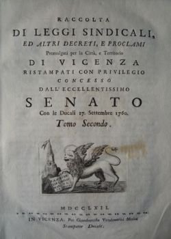 Raccolta di leggi sindicali, ed altri decreti e proclami promulgati per la Città e Territorio di Vicenza, ristampati con privilegio concesso dall'eccellentissimo Senato con le Ducali 27 Settembre 1760. Tomo secondo.