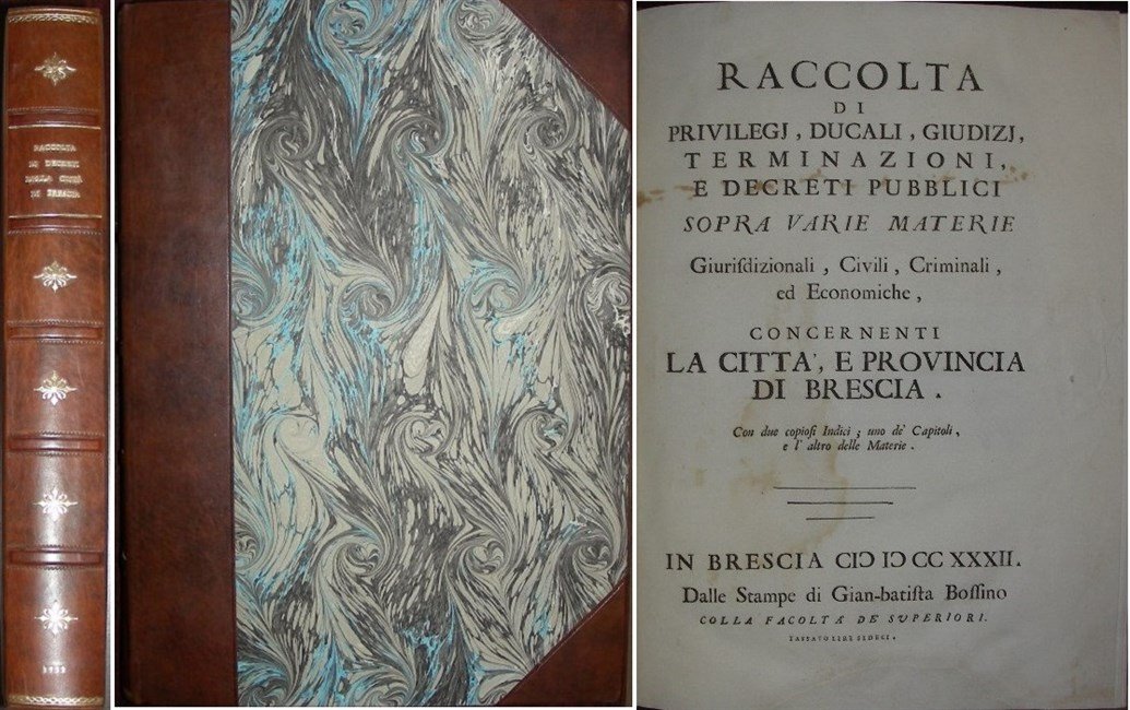 RACCOLTA DI PRIVILEGJ, Ducali, Giudizi, Terminazioni e Decreti pubblici sopra varie materie giuridizionali, civili, criminali, ed economiche concernenti la città e provincia di Brescia. Con due copiosi indici, uno de' Capitoli e l'altro delle Materie.