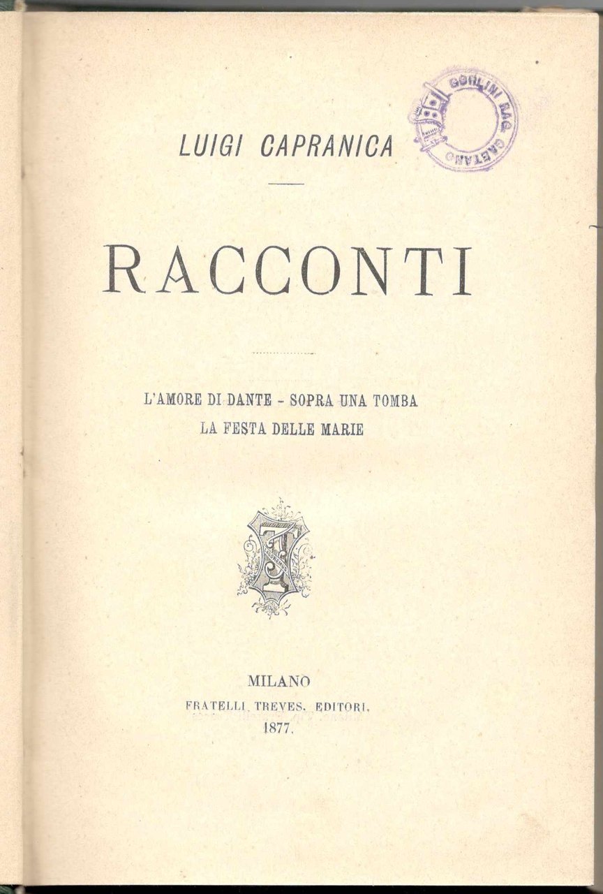 In 16°, pp. 265, (7). Mezza tele verde dell'epoca con titoli oro sul dorso. Piccolo timbro privato di possesso sul frontespizio. Copia molto buona. Prima edizione.