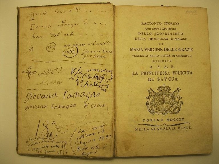 Racconto storico con nuove addizioni dello scoprimento della prodigiosa immagine di Maria Vergine delle Grazie, venerata nella citta' di Cherasco, dedicato a S. A. R. la Principessa Felicita di Savoja