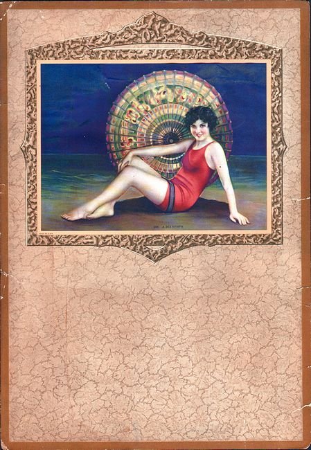 Figura a colori in offset di bagnante seduta in riva al mare. Misure della figura cm 14,5 x 19,5; applicata su cartoncino decorato, sicuramente nella parte inferiore a supporto del calendario (cm 39 x 26,5). Qualche piccolo strappetto ai margini, ma senza perdite.
