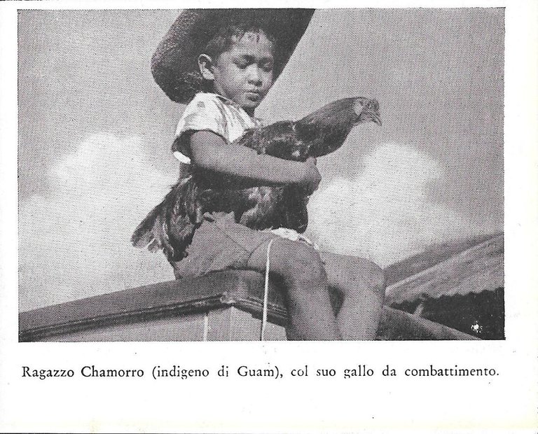 Ragazzo Chamorro (indigeno di Guam) col suo gallo da combattimento. Stampa 1934