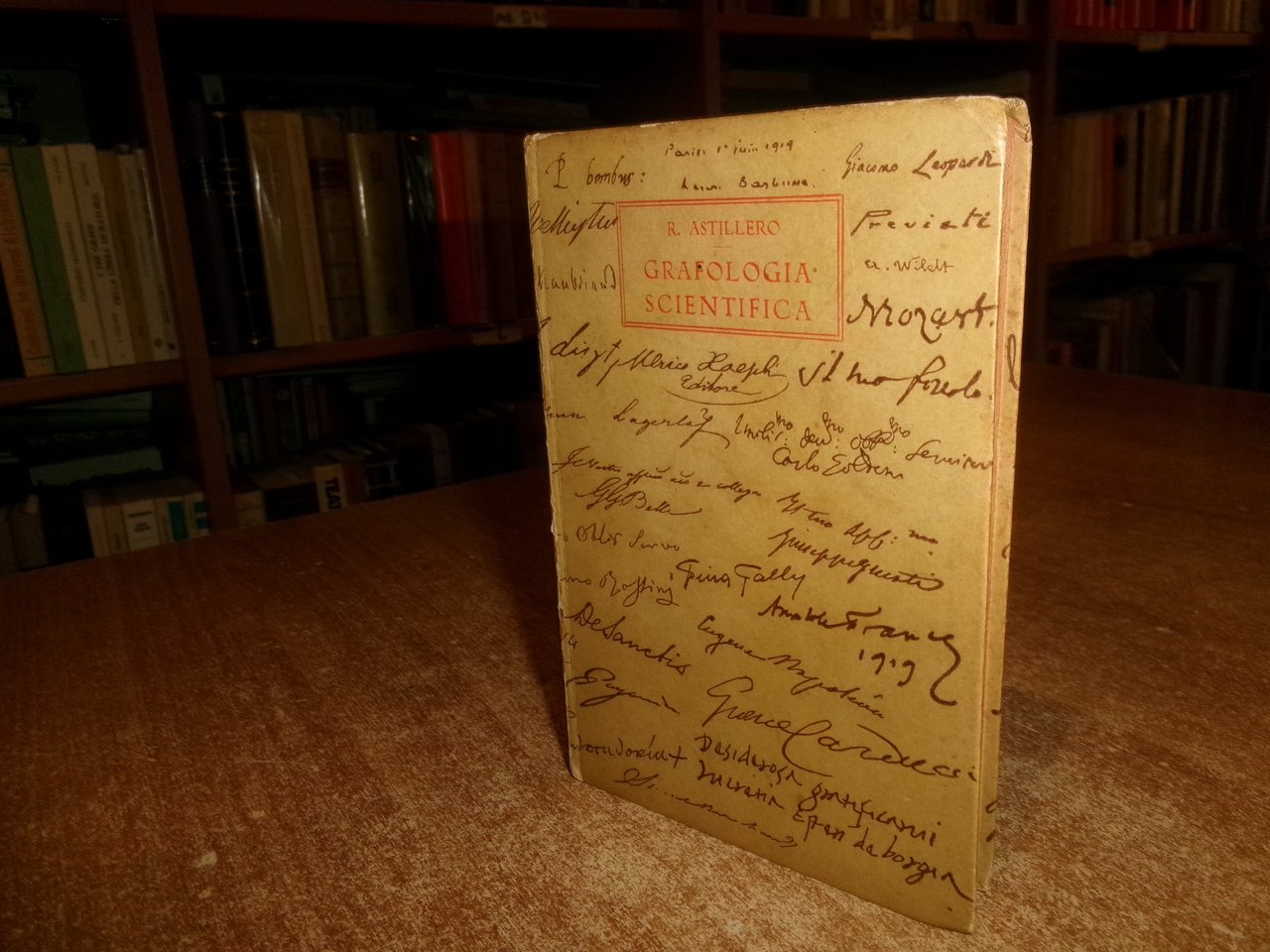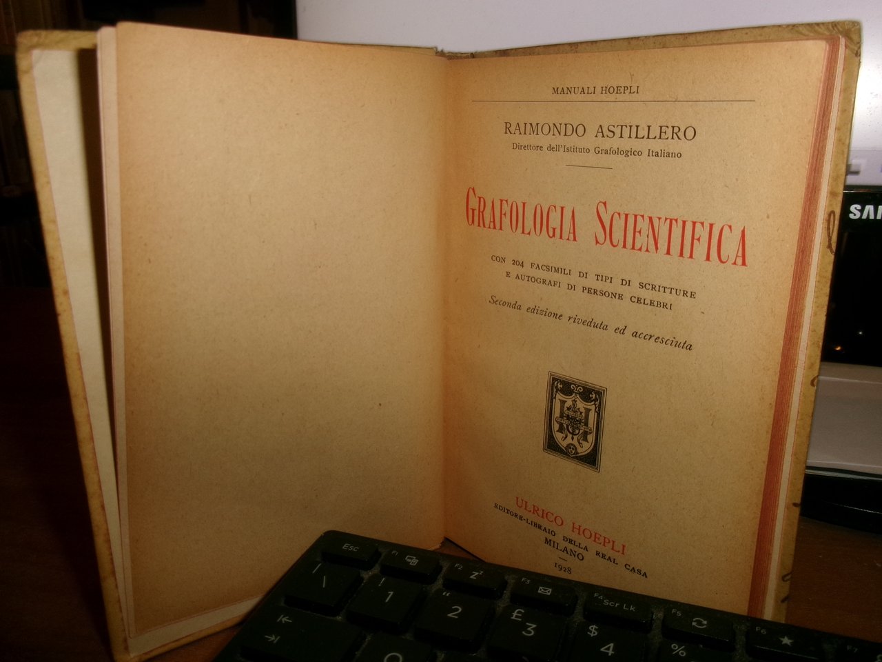 RAIMONDO ASTILLERO. Grafologia Scientifica. Seconda edizione riveduta ed accresciuta. Milano, Ulrico Hoepli, 1928. In-16°, cartonato edit., tagli in rosso. xliii, 286 pp. con 204 facsimili di tipi di scritture e autografi di personaggi celebri. Ben conservato. Neg. scat. ultimo Hoepli.