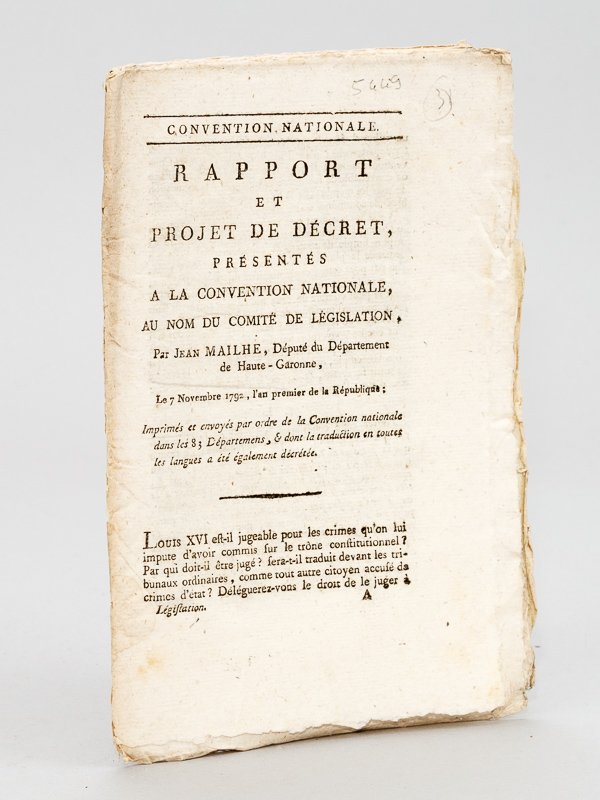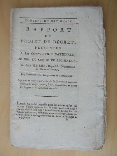 Imprimé par ordre de la Convention Nationale dans les 83 Départemens, & dont la traduction en toutes les langues a été également décrétée, 1 brochure in-8 en feuilles, De l'Imprimerie Nationale, s.d., 27 pp. Edition originale. Etat très satisfaisant. Brochure relative au jugement de Louis XVI. Tourneux, I, 3609 (qui signale également l'existence d'un autre tirage qui n'a que 20 pp.). Martin & Walter, 22416. Jean Mailhe, ancien avocat au Parlement de Toulouse, vota contre l'appel au peuple et pour la mort du Roi. Il reste dans l'histoire de ce procès comme l'auteur de "l'amendement Mailhe", qui entraîna un troisième vote, sur un éventuel sursis.