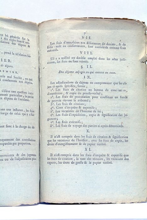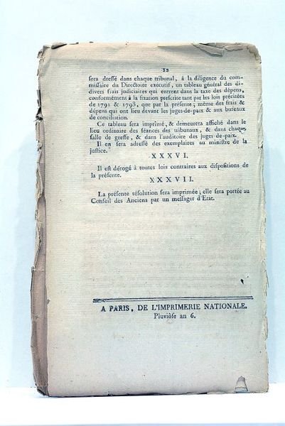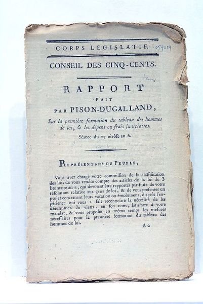 in-8. 2pp. Broché. Exemplaire non rogné. Papier légèrement roussi. Publié à Paris en l'an 6 de la République Française, soit 1797, cet ouvrage d'A.F. Pison du Galland se penche sur les fondements de l'organisation judiciaire post-révolutionnaire, en mettant un accent particulier sur la formation des professionnels du droit et sur la structure des dépens judiciaires.