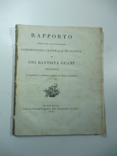 In 8 (cm 19 x 24), pp. 22 + (2). Brossura rifatta con carta d'epoca. Relazione del medico Giovanni Battista Guani (1766-1847)  sulla sua indagine sanitaria compiuta in alcuni paesi liguri: Recco, Celesia, Orsica, Casareggio, Riomaggiore, Ricco'. A Recco, ad esempio "si era manifestata una febbre dal carattere molto grave" che - secondo l'Autore - era da ricondursi a tifo; altre malattie si erano diffuse negli altri paesi da lui visitati. Guani lamentava anche il fatto che in molte zone non ci fosse un presidio medico adeguato atto a garantire la salute della popolazione e auspicava quindi la presenza fissa di un medico incaricato di sorvegliare la salute della collettivita'.