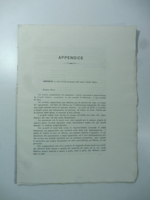 In 4 (cm 23 x 31 circa), pp. 16. Pagine intonse. Privo di legatura all'origine. Stralcio dagli Atti del R. Istituto d'Incoraggiamento di Napoli. Appendice comprendente vari articoli consecutivi (ciascuno di 1 o 2 pagine). Contributi presenti: Rapporto sui varii modelli presentati dall'artista Camillo Sellaro; Rapporto sui nuovi metodi e processi inventati dal prof. Strianese; Rapporto sul ritrovato del tipografo sig. Tonese; Rapporto sopra due congegni dell'Ing. Cav. Francesco Giura; Rapporto sul nuovo ferro fisiologico da cavallo del dottor Augusto Meloni; Rapporto per la fabbricazione di mattoni, tegole, tubi di conduttura dei sig. Fontana e Minutillo. Da pagina 11 a pagina 16 segue l'elenco de libri ricevuti in dono dall'Istituto.