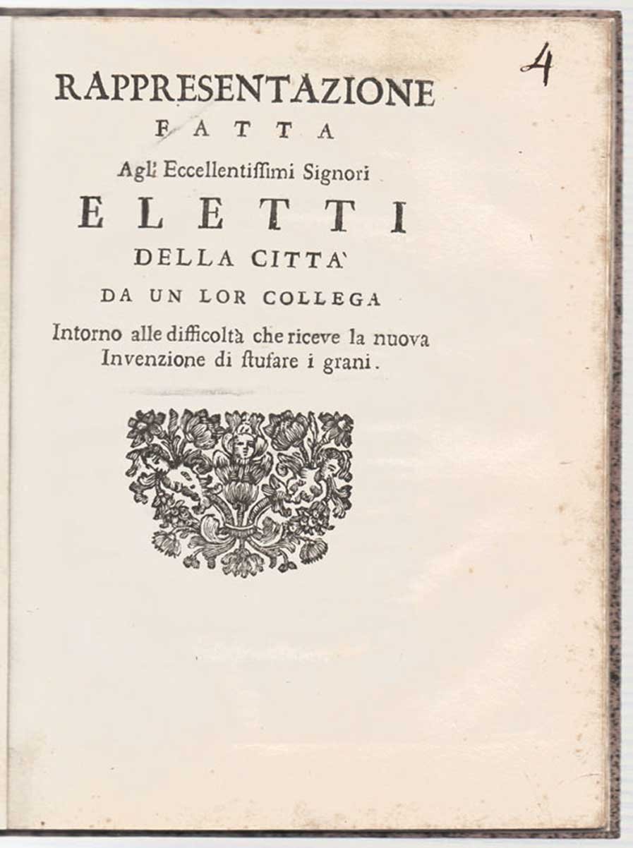 Rappresentazione fatta agli eccellentissimi signori eletti della città da un lor collega intorno alle difficolta che riceve la nuova invenzione di stufare i grani