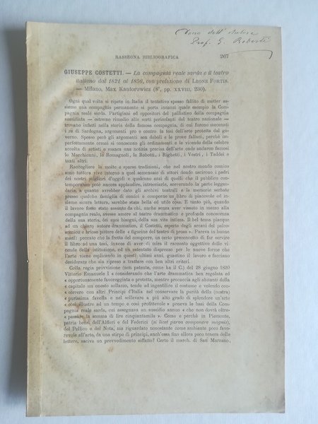 In 8 (cm 15 x 24), pagine numerate da 267 a 274. Privo di legatura all'origine (con rinforzo al dorso). Fioriture sparse. Omaggio autografo alla prima pagina. Recensione bibliografica del volume scritto da Giuseppe Costetti dal titolo "La Compagnia Reale Sarda e il teatro italiano dal 1821 al 1856" pubblicato a Milano nel 1893.