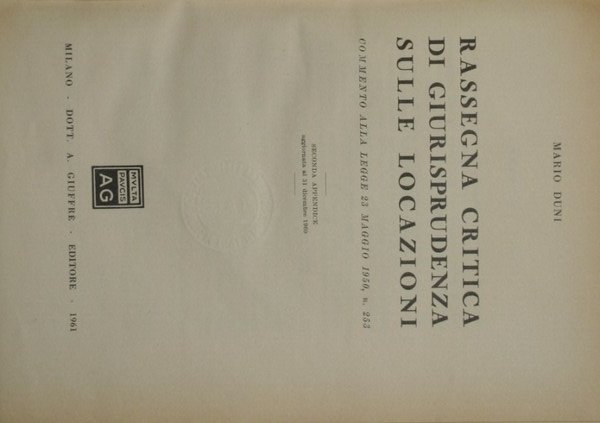 Commento alla legge 23 maggio 1950, n. 253 - Seconda appendice aggiornata al 31 dicembre 1960 - in 8° - pp.567 - Mezza tela dorso con titolo in oro