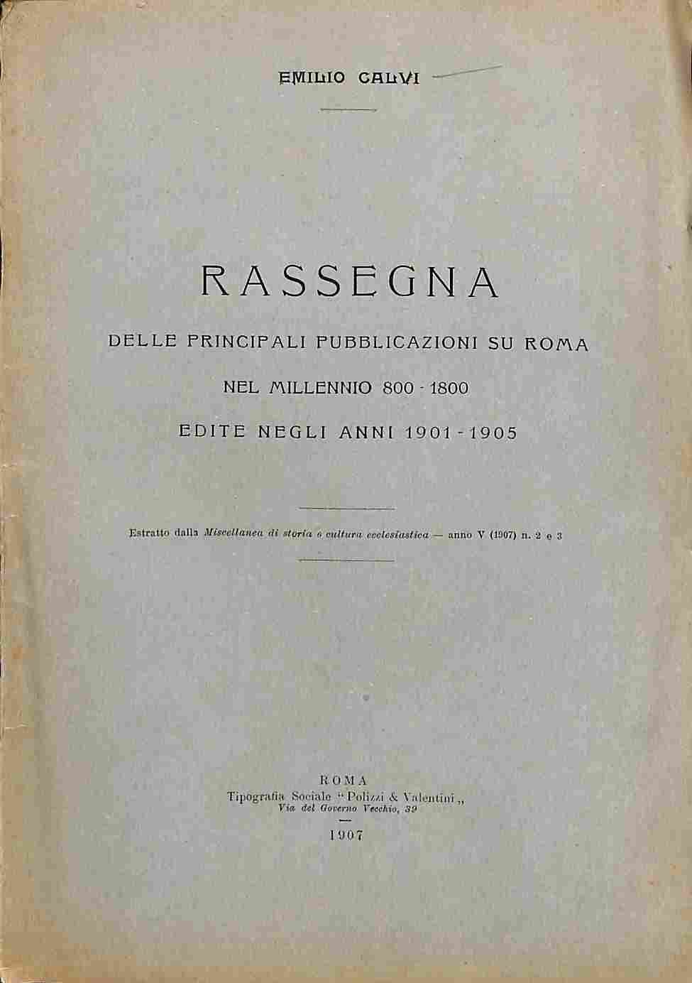 In 8 (cm 16 x 23), pp. 34 + (2 bianche). Brossura editoriale. Estratto editoriale dalla Miscellanea di storia e cultura ecclesiastica. Bibliografia di opere su Roma pubblicate tra 1901 e 1905.