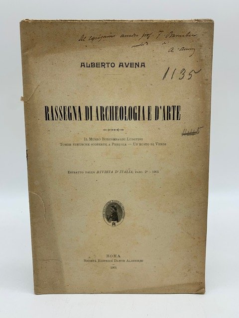 In 8 (cm 16 x 24), pp. 31 + (1 bianca) con 2 tavole fuori testo con riproduzioni fotografiche in bianco/nero e 16 riproduzioni fotografiche in bianco/nero intercalate al testo. Dedica autografa al piatto anteriore. Brossura editoriale. Estratto editoriale dalla Rivista d'Italia contenente tre articoli: Il Museo Boncompagni Ludovisi; Tombe etrusche scoperte a Perugia; Un busto di Verdi.