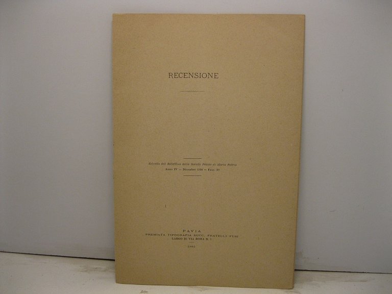 In 8, pp. (2). Br. ed. Estratto dal 'Bollettino della Societa' Pavese di Storia Patria' (Anno IV, fasc. I, dicembre 1904). Recensione del libro di Antonio Cavagna Sangiuliani (Alessandria, 1843 - Milano, 1905), studioso di storia municipale e appassionato bibliofilo, dal titolo 'Le Chiese e il Chiostro di Piona' (Milano, Cogliati, 1904).