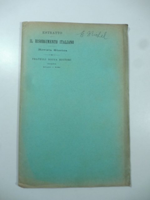 In 8 (cm 15,5 x 23), pp. 10. Brossura editoriale. Recensioni ai seguenti libri: La spedizione della marina sarda a Tripoli di G. Ferrari; L'unita' d'Italia e la casa di Savoia di A. Roviglio; Saggio biografico di Giovanni Maria Archetti dei Mille di Marsala di F. Sclavo; Garibaldi. Libro di lettura per il popolo italiano ridotto da R. Gustalla di G. Guerzoni; Carteggio fra Girolamo Tiraboschi e Clementino Vannetti.