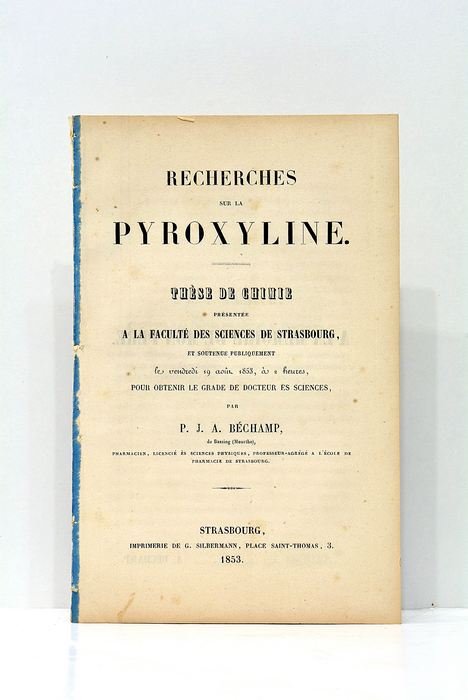 31 pages. Planche dépliante. (20x13 Cm). Dérelié. Edition Originale très rare de la thèse de chimie du médecin lorrain Antoine Béchamp. Cette étude est consacrée à la pyroxiline (nitrocellulose), avec des observations nouvelles. Elle est dédiée à Louis Pasteur, détail curieux en raison de la rivalité qui opposera plus tard les deux hommes. L'héritage scientifique de Béchamp est aujourd'hui revendiqué par les détracteurs de la médecine conventionelle et de la vaccination. Planche dépliante. Document très bien conservé.