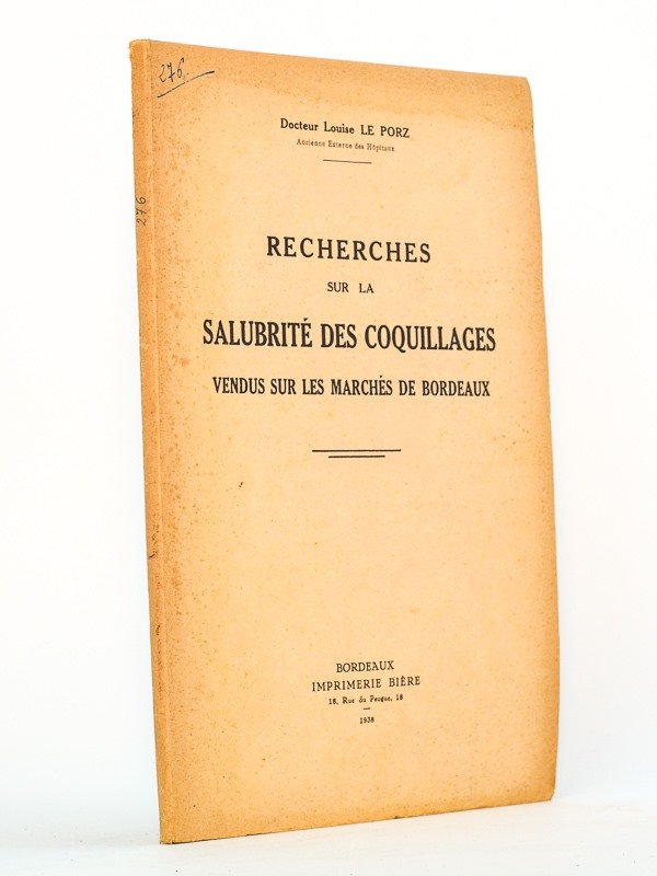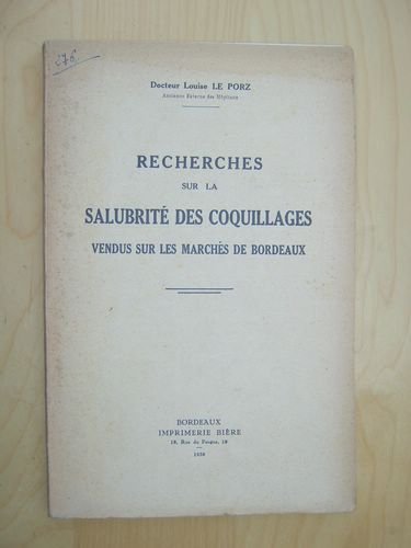 1 vol. in-8 br., Imprimerie Bière, Bordeaux, 1938, 57 pp. Bon état (petite annotation en couv. et garde, bon exemplaire par ailleurs) pour cette thèse peu courante. Les résultats de cette étude étaient inquiétants. L'auteur concluait de la nécessité de renforcer la réglementation sanitaire alors en vigueur (décret du 21 juillet 1923), tout en reconnaissant que [.] "même de l'avis des plus pessimistes, la salubrité des huîtres a été améliorée, d'une façon très nette, depuis l'application du décret de 1923".