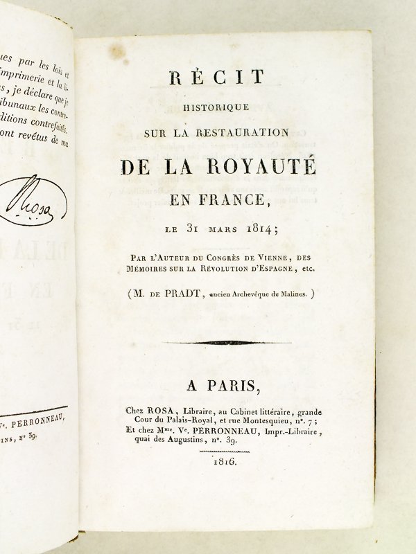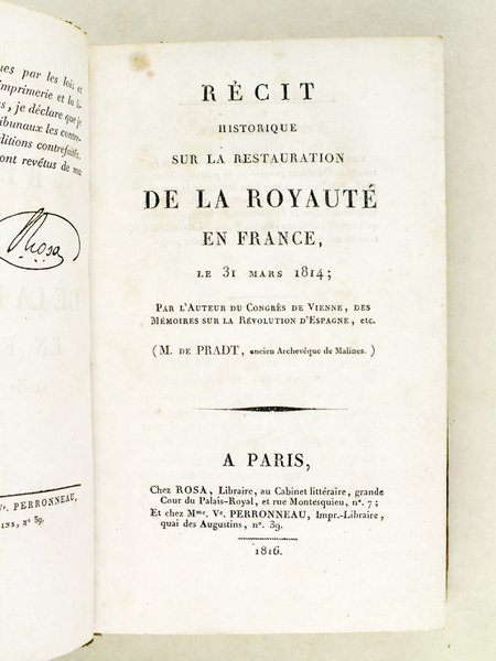 1 vol. in-8 reliure de l'époque pleine basane racinée : Récit Historique sur la Restauration de la Royauté en France, le 31 Mars 1814, Chez Rosa et Ve Perronneau, Paris, 1816, 103 pp. [Suivi de : ] Lettre à un Electeur de Paris, F. Béchet, Paris, Septembre 1817, 141 pp. [Suivi de : ] Préliminaires de la Session de 1817, F. Béchet, Paris, Novembre 1817, 237 pp. [Suivi de : ] Des Progrès du Gouvernement représentatif en France. Session de 1817. Article premier, F. Bechet, Paris, Décembre 1817, 59 pp. Intéressant recueil de 4 titres par De Pradt. Etat moyen (rel. très abîmée, avec importants mq. de cuir, très bon état intérieur).
