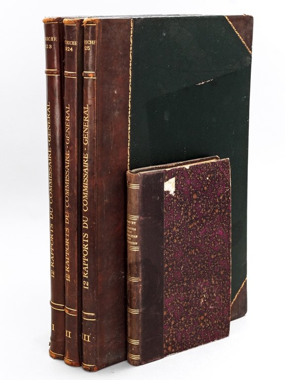 3 vol. grand in-4 reliure éditeur demi-basane à coins marron, dos à 2 nerfs, Imp. Kundig, SDN, 1923-1925, Tome I : 31-34-35-30-29-39-25-28-24-24-44-32 pp. ; Tome II : 28-26-22-17-15-18-19-15-16-22-19-23 pp. ; Tome III : 19-16-16-20-18-16-17-20-28-18-21-22 pp. et 1 vol. in-12 reliure de l'époque demi-basane marron, Librairie des Sciences Politiques et Sociales Marcel Rivière, Paris, 1927, 158 pp. Rappel du titre complet : Reconstruction Financière de l'Autriche [Rapports du Commissaire Général de la Société des Nations à Vienne soumis au Conseil du Premier Rapport du 1er Février 1923 au Trente-Sixième Rapport du 31 décembre 1925 ] [ Livres dédicacés par le Commissaire général de la SDN en Autriche le Docteur A.-r. Zimmerman] Première Année : Reconstruction Financière de l'Autriche ; Deuxième Année : Relèvement Financier de l'Autriche ; Troisième Année : Restauration Financière de l'Autriche [ On joint : ] La Restauration Monétaire et Financière de l'Autriche [ par G.-H. Bousquet ] Exceptionnel ensemble réunissant les 33 premiers "Rapports du Commissaire Général de la Société des Nations à Vienne" relatifs à la reconstruction financière de l'Autriche. Chacun des 3 tomes est dédicacé par le commissaire Zimmerman à son collaborateur G.-H. Bousquet ; nous joignons à cet ensemble remarquable la propre contribution du Docteur Bousquet à ce même sujet (dont la dédicace imprimée est offerte "Au Docteur A.-R. Zimmerman, ancien commissaire Général de la Société des Nations en Autriche, Hommage d'un admirateur et d'un témoin"). Bon ensemble (rel. lég. frottée, très bon état par ailleurs) de la plus grande rareté, provenant de la propre bibliothèque du professeur Georges-H. Bousquet. Le professeur Georges-Henri Bousquet (1900-1978), après une thèse en droit (1923) sur "L'évolution sociale en Hollande 1914-1922", devint un spécialiste de questions économiques. Ses missions à l'étranger, le conduisirent notamment à Vienne, peu de temps après sa thèse, dans le cadre de la mission de la SDN pour la restauration financière de l'Autriche. G.-H. Bousquet reste connu comme un économiste ami de Pareto et Schumpeter, ainsi que comme un islamisant de l'école de Goldziher et Snouck-Hugronje. Il fut notamment proche de son maître Vilfredo Pareto, dont il servit fortement la pensée et avec lequel il entretint une correspondance. Il connut personnellement, outre Joseph Schumpeter ou Pareto, d'aussi grands noms de la science économique tel que Irving Fisher ou Albert Aupetit, disciple de Léon Walras. On peut signaler que G.-H. Bousquet fut le chercheur français le plus cité dans l'Histoire de l’Analyse Economique de Schumpeter. Quant au docteur A-R. Zimmerman, il était l'ancien bourgmestre de Rotterdam. Les collaborateurs du commissaire général furent les suivants : Mrs J. de Bordes (Hollandais), Pierre Quesnay (Français), J.-H. Van Walré de Bordes (Hollandais), A. Pelt (Hollandais), ces trois derniers du secrétariat de Genève ; une fois retournés au secrétariat, ils furent remplacés par Mrs Rost Van Tonningen (Hollandais), Krabbé (Danois), celui-ci du Secrétariat, et G.-H. Bousquet (Français). Prix du lot, non séparable.