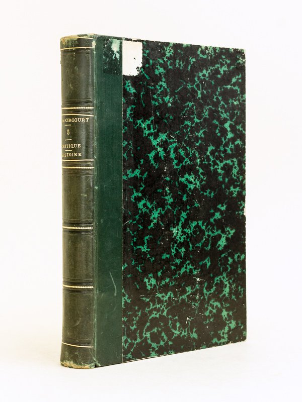 1 vol. in-8 reliure de l'époque demi-basane verte, tomaison marquée : "5 - Critique - Histoire" :Novgorod-Véliki, ; Histoire sur le Voyage du Roi Harald, et l'établissement du Christianisme dans les provinces Danoises, pp. 149-167 ; Sur une croisade des Norwégiens en Palestine, au commencement du douzième siècle, tiré des sources originelles, Tiré de la Bibliothèque Universelle de Genève, Juin 1831, 14 pp. ; La Confédération Suisse, Extrait du Correspondant, Charles Douniol, Paris, 1970, 32 pp. ; Le Général Le Fort, son Temps et sa Vie, Extrait de la Revue de Paris, du 15 janvier 1868, De l'Imprimerie L. Toinon et Cie, Saint-Germain, 1868, 22 pp. ; Gustave-Adolphe, pp. 434-453 ; Recension de : Episode de l'Histoire du Hanovre. Les Koenigsmark par Henri Blaze de Bury, Tiré de la Bibliothèque Universelle de Genève, Décembre 1855, 15 pp. ; L'Autriche sous Marie-Thérèse, pp. 490-514 ; Un épisode de la guerre d'Allemagne de 1866. Les Hanovriens en Thuringe et la Bataille de Langensalza, pp. 460-474 ; Recension de : Les quatre Conquêtes de l'Angleterre par M. Emile de Bonnechose, Tiré de la Bibliothèque Universelle de Genève, 1852, 7 pp. ; Une Nouvelle Histoire d'Angleterre, 23 pp. ; Recension de : Histoire d'Angleterre jusqu'à l'époque de la Révolution française par De Bonnechos, 28 pp. ; Recension de : Macaulay. Histoire du règne de Guillaume III, Tiré de la Bibliothèque Universelle de Genève, novembre 1858, 38 pp. ; Recension de : Histoire de la Corse. Historia di Corsica par l'archidiacre Filippini, Tiré de la Bibliothèque Universelle de Genève, mai 1852, 18 pp. ; Publications récentes de l'Ecole historique de Turin, 35 pp. ; Le Codex Cavensis, pp. 633-636 ; Recension de : Histoire du Règne de Ferdinand et d'Isabelle la Catholique, Souverains de l'Espagne par Willima Prescott, Tiré de la Bibliothèque Universelle de Genève, 1838-1839, 48, 35, 31, 27, 40 pp. ; Recension de : Histoire de la Conquête du Mexique par William Prescott, Tiré de la Bibliothèque Universelle de Genève, novembre 1844, 23 pp. ; Recension de : The life of Prince Henry of Portugal surnamed the Navigator by Richard Henry Major, pp. 332-360 ; Recension de : Fernand Colomb, sa vie et ses travaux, par Harrisse, Revue des Questions Historiques, pp. 520-524 ; Recension de : Charles-Quint, son abdication, son séjour et sa mort au monastère de Juste, par M. Mignet, Tiré de la Bibliothèque Universelle de Genève, Mars 1855, 41 pp. ; Retraite et mort de Charles-Quint, pp. 740-752 Recueil original d'articles (souvent en tirés-à-part originaux) du Comte Adolphe de Circourt. Le salon d'Anastasie de Circourt et de son mari le Comte Adolphe de Circourt fut l'un des plus célèbres du XIXe siècle. Comme l'écrit Sainte-Beuve, "aucune prévention, aucun préjugé n’arrêtait cette personne, si pieuse d’ailleurs et si ferme dans ses croyances, dès qu’elle sentait qu’elle avait affaire à un esprit de valeur et à un homme de talent". Correspondant de Tocqueville, le Comte collabora à de nombreuses revues (Revue Britannique, Revue Contemporaine, Revue Britannique, etc.). Etat très satisfaisant (mq. de papier au premier plat, ex-libris Bibliothèque des Bruyères, très bon état par ailleurs) pour cet recueil établi par l'auteur, le Comte de Circourt et provenant de sa bibliothèque des Bruyères, à La Celle-Saint-Cloud.