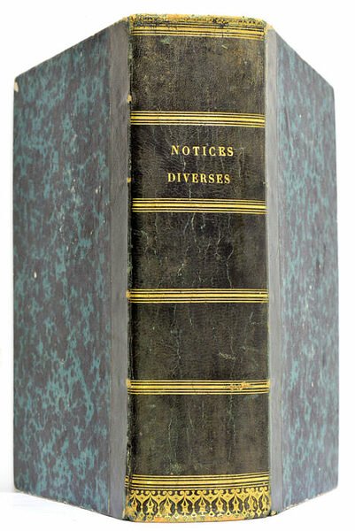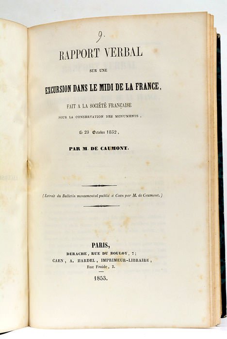 25 ouvrages en 1 volume. (21x14 Cm). Demi veau. Dos lisse orné. Coins et coiffes émoussés. Charnières frottées. Intéressant recueil de 25 ouvrages sur des sujets divers, parus entre 1845 et 1861. Ils ont été réunis en un volume à l'époque et concernent la Normandie, les sciences et techniques, les arts, etc. On y trouve entre autres, les textes suivants : 1). BERTRAND (E.). Peinture sur Verre. Notice sur les travaux de M. Vincent Larcher, Peintre sur verre… Troyes, 1845. 2). PICARD. Un Mystère représenté au XIIIe siècle en l'honneur de Saint-Nicolas. (Rouen, 1846). 3). ESSAI historique sur l'Abbaye de Solesmes… Le Mans, Fleuriot, 1846. 4). PRECIS analytique des travaux de l'Académie Royale des Sciences, Belles-Lettres et Arts de Rouen pendant l'année 1847. Rouen, Péron, 1847. 5). PICARD. Rapport sur la traduction publiée par M. Bénard des écrits philosophiques de Schelling. Rouen, Péron, 1848. 6). CARAMAN (Comte Georges de). Chapelle du Château d'Anet. Cérémonie de la Bénédiction… Chartres, Garnier, 1851. 7). DE CAUMONT. Rapport Vérbal sur une Excursion dans le Midi de la France…Paris, Derache, 1853. 8). CORNUEL (J.). Notice sur la cause des Mouvements de Rotation et Translation de la Terre et des autres Planètes… Paris, 1854. 9). FERLAND. Observations sur un ouvrage intitulé Histoire du Canada par M. L'Abbé Brasseur de Beaubourg. Paris, Douniol, 1854. 10). GLANVILLE. Visite aux Monuments Celtiques de Carnac et de Lockmariaker. Rouen (1856). 11). COCHET. Sépultures Chrétiennes de la période anglo-normande, trouvées à Bouteilles, près Dieppe … Paris, Derache, 1859. 12). COCHET. La Seine Inféreure au temps des Gaulois. Rouen, Péron, 1861. (Liste complète sur demande) Plusieurs pièces comportent un envoi à l'Abbé Delaharpe, Supérieur au Petit Séminaire de Rouen. Rousseurs. Table manuscrit au début du recueil. Bon exemplaire. Quelques illustrations in-texte.