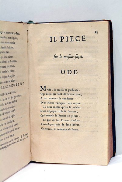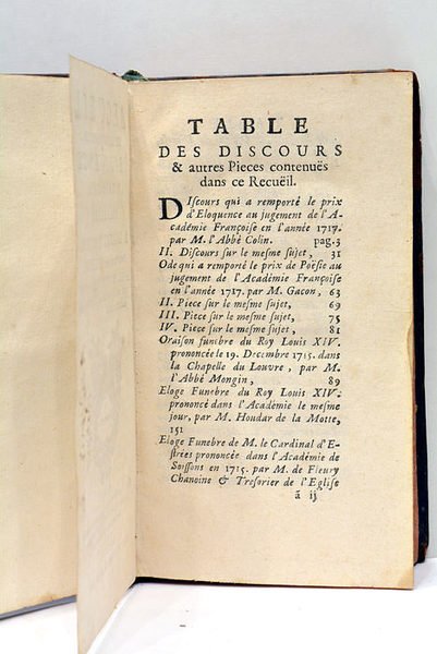 in-12. 432pp. Plein veau, dos à nerfs orné (reliure de l'époque frottée). Rousseurs éparses. "Académie de Béziers", écrit à la main à la page de titre. Recueil de pièces de l'Académie française contenant entre autres un discours de l'abbé Colin, une invitation aux Muses de Danchet, etc.