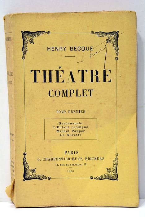 Tome I seul. 352 pages. 5 feuillets. (18,5x12cm). Broché. Couverture imprimée brunie et salie avec petites taches éparses. Publié à Paris en 1890, ce premier tome du théâtre complet d'Henry Becque s'inscrit dans un contexte de renouveau dramatique en France. À une époque où le théâtre naturaliste commence à s'imposer, Becque se distingue par sa critique acerbe des mœurs de la société de son temps. Ses pièces, souvent considérées comme précurseurs du naturalisme théâtral, mettent en lumière les hypocrisies sociales et les conflits intérieurs de ses personnages, reflétant ainsi les tensions et les transformations de la fin du XIXe siècle. Papier bruni avec petites taches et légères rousseurs. Cahier légèrement déboîté. Petites déchirures marginales et traces de plis.