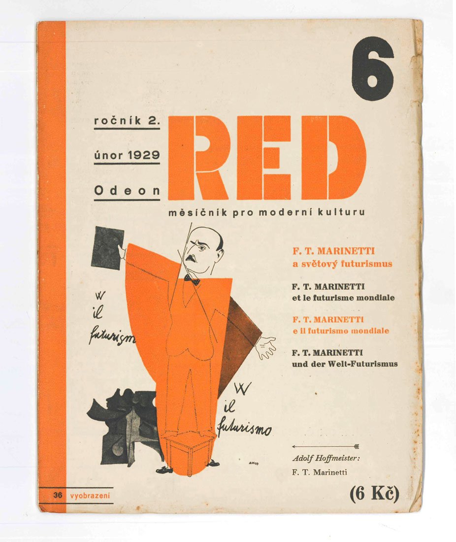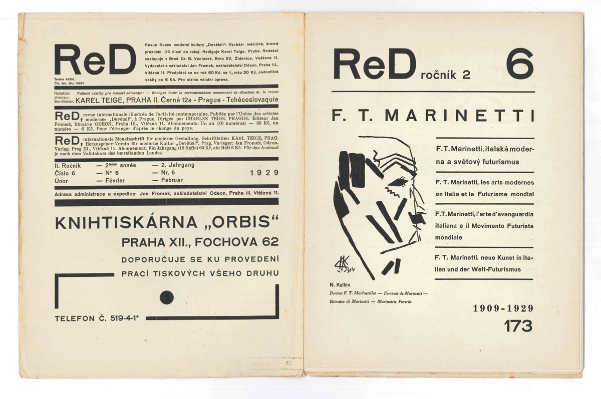 ReD [Revue Svazu moderni kultury “Devětsil”] ročník 2 — 6 [anno II, n. 6]. F.T. Marinetti. F.T. Marinetti, italska moderna a svetovy futurismus 1909-1929 [.] F.T. Marinetti, l’arte d’avanguardia italiana e il Movimento Futurista Mondiale. 1909-1929