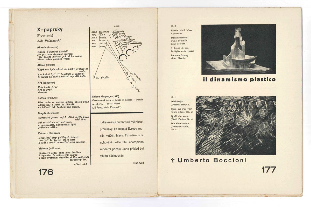 PERIODICOPrima edizione.Ottimo esemplare (pagine appena brunite, come normale; lievi pieghe e fioriture al bordo esterno della copertina), pulito e intatto sia all’interno che alla copertina; proveniente dalla prestigiosa collezione futurista di Giampiero Mughini.Raro numero monografico del mensile internazionale del gruppo d’avanguardia praghese «Devětsil» diretto da Karel Teige, dedicato a Marinetti nei vent’anni del Futurismo. Notevoli contenuti — con parolibere in italiano e voltate appositamente in ceco — e parte iconografica. Il grosso del fascicolo è occupato dal corposo saggio «F.T. Marinetti + italska moderna + svetovy futurismus» di Teige, pure riccamente illustrato. «L’intero insegnamento che l’avanguardia ceca ha tratto dal futurismo è infine ben riassunto da Karel Teige nel numero monografico della rivista “ReD” del febbraio 1929» (Diz. Fut. p. 250b).Hulten, Futurismo e futurismi, p. 597; Nešlehová, Impulses of Futurism and Czech Art (in: Berghaus, ed., International Futurism in Arts and Literature: 122-144); Echaurren, Nel paese dei bibliofagi, p. 197 fig. 15