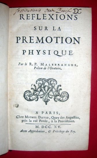 In 12°, pp. (8), 351, (1 di errata). Leg. dell'epoca piena pelle. Dorso a nervetti con fregi oro e titoli su tassello (difetti alle cerniere). Es. molto buono. Si tratta dell'ultima opera di Malebranche, scritta in risposta al libro 'De l'action de Dieu sur les créatures' di Laurent Boursier. Rispondendo alle accuse di ateismo lanciate contro di lui, particolarmente dai padri Gesuiti, Malebranche sostiene che le azioni dell'uomo sono libere, non condizionate dalla volontà di Dio. EDIZIONE ORIGINALE. Cfr. Cioranescu 44889; Brunet III - 1336.