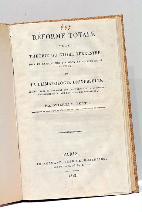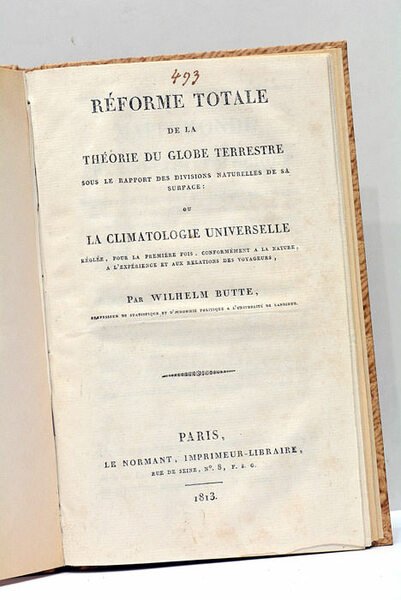 Réforme totale de la Théorie du Globe Terrestre sous le rapport des divisions naturelles de sa surface: ou Climatologie Universelle réglée pour la première fois, conformément à la nature, à l'expérience et aux relations des voyageurs. RELIE AVEC (à la suite): 2). (du même). Mappemonde physio-climatologique. Prospectus et conditions de souscription. S.l.n.d. (Paris, 1813).