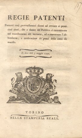 Regie Patenti riguardo i vari provvedimenti diretti ad ovviare agli abusi nella macellazione . 7 maggio 1790.