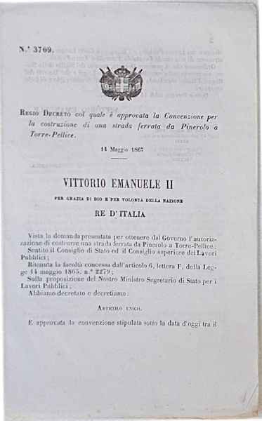 Regio Decreto col quale è approvata la convenzione per la costruzione di una strada ferrata da Pinerolo a Torre-Pellice.