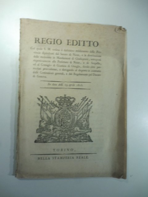 In 8 (cm 20 x 29), pp. 16. Grande stemma xilografato. Regio Editto con il quale sono stabilite le terre che soggette alla giurisdizione del Senato di Nizza (Nice) comprendente le province dipendenti dalla prefettura di Nizza, di Sospello e di Oneglia. Ciascuna provincia sara' poi suddivisa in mandamenti. I giudici nominati dovranno avranno residenza nel capoluogo del mandamento. I Giudici nominati dovranno una volta al mese tenere udienza nei luoghi dipendenti dal loro mandamento mentre dovranno tenere udienza una volta alla settimana i giudici di S. Martino di Lantosca, di Tenda, Dolceacqua, Diano Castello e Diano Marina. Segue da pagina 13 lo Stato delle Province dipendenti dal Senato di Nizza, di Sospello e Oneglia con elenco, per ciascuna, dei luoghi.