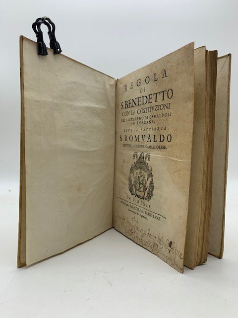 In 8 (cm 16,5 x 23,5 circa), pp. 6 + 291 + (1 bianca). Le 4 pagine con l'indice non sono state montate al fondo ma sono state intercalate all'inizio tra la dedica a Papa Clemente X e l'inizio della Regola (tra pagina 6 e pagina 7). Annotazione di possesso manoscritta al frontespizio, varie interessanti annotazioni manoscritte con grafia antica ai margini bianchi del testo e all'ultima pagina bianca. Alone al frontespizio e ai successivi 3 fogli. Legatura settecentesca in piena pergamena con titolo manoscritto al dorso e qualche forellino di tarlo ai piatti. A pagina 14 bella illustrazione xilografata riquadrata raffigurante S. Romualdo. Edizione originale, rara, delle Costituzioni dell'eremo di Camaldoli promulgate nel 1671. La comunita' di Camaldoli si presenta fin dalla fondazione (1024) articolata in due gruppi: l'Eremo e il Monastero. Essa e' sempre stata casa-madre di Congregazione, dapprima di tutti i monaci camaldolesi, e poi, dal 1600, solo degli Eremiti camaldolesi di Toscana. Quest'ultima Congregazione ebbe una diffusione limitata al territorio toscano e non supero' i 100-150 monaci; in Toscana operava pure la Congregazione dei monaci camaldolesi la quale, piu' consistente numericamente, ebbe una notevole presenza culturale. Nel 1935 la Santa Sede unifico' forzatamente le due congregazioni.