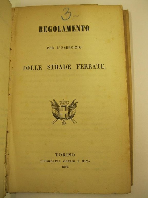 In 8, pp. 80 con 4 carte f.t. piu' volte rip. Strappetto ad una delle cartine rip. Br. rifatta con carta d'epoca. Argomenti: Manutenzione della strada; Mantenimento e polizia della strada; Doveri dei capi-officina; Doveri dei macchinisti, dei guarda-freno, dei guarda-bagagli, ecc.; contabilita' dei biglietti dei viaggiatori e fogli di via; Segnali nella via e nelle stazioni; Regolamento per il magazzino.
