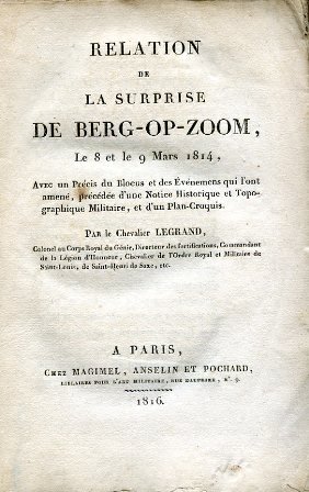 In-8° (213x128mm), pp. (4), 132, brossura muta coeva di colore azzurro. Ripiegata in fine, una tav. calcografica della piazzaforte di Berg-Op-Zoom. In barbe, con fioriture e bruniture usuali, ben conservato. Una firma coeva. Edizione originale di questa memoria sull'assedio dell'8 e 9 marzo 1814 della piazzaforte olandese di Berg-Op-Zoom (o Bergen-Op-Zoom), nel Brabante settentrionale, a 30 kilometri a nord di Anversa. La piazzaforte, fondata nel 1287 e assediata dagli spagnoli nel 1555 e nel 1622, venne in seguito fortificata da Cohorn; conquistata dai francesi nel 1747 dopo un celebre assedio, nel 1814 venne vanamente assediata dagli inglesi, nelle circostanze descritte in dettaglio nel presente volume, prima di essere resa alla Francia. Il Legrand fu colonnello del Genio, direttore delle fortificazioni, cavaliere della Legion d'Onore, dell'Ordine di San Luigi e dell'Ordine di Sant'Enrico di Sassonia. Garnier, Complément et supplément à la Nouvelle bibliographie critique des mémoires sur l'époque napoléonienne de Jean Tulard, 1626: 'Le témoignage est remarquable de vérité et de précision'.