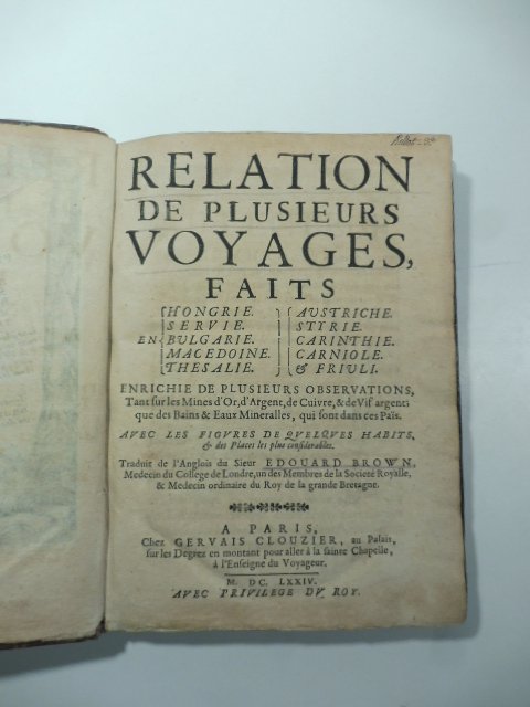 In 8, cm 17 x 23, pp. (8) + 208 con 1 frontespizio inciso che precede quello tipografico e 8 tavole fuori testo incise all'acquaforte (alcune ripiegate e con qualche brunitura). Piena pelle coeva con fregi oro e nervature al dorso. Qualche danno alle cerniere. Edizione rara, in particolare completa delle otto tavole della relazione di viaggio di questo medico e naturalista inglese. Di particolare interesse il fatto che i paesi attraversati da Brown, che fece questo viaggio nel 1668, fossero in gran parte sotto l'impero ottomano e che quindi potessero essere pochi i viaggiatori ad avventurarsi in questa parte d'Europa. Molte delle osservazioni sono di carattere naturalistico, in particolare geologico e minerario. Brown narra la discesa nella miniera di Vinschacht in Ungheria, descrive i minerali estratti dalla miniera detta della 'Montagne du Paradis' e quelli della miniera di Misnie ecc.