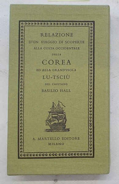 In 16° (cm. 17,5 x 10); pagg. 313; con 5 tavole a colori f.t.; leggera cartonatura originalefigurata e astuccio rigido figurato. VG+. ** Bella edizione, tratta da quella di Sonzogno del 1820. Ottimo esemplare. Il viaggio fu compiuto nel 1816. "Poco o nulla della costa occidentale di Corea fu noto sino ad ora in Europa".