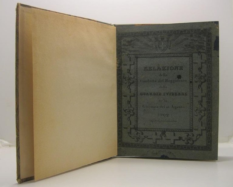 2 opere rilegate in un tomo in 8 grande con numerazione consecutiva, pp. (6) + 40 con una tav. f.t. rip. con facsimile dell'ordine trasmesso dal re al capitano de Durler all'assemblea nazionale il 10 Agosto, 2 tavv. f.t. in lit., e 2 tavv. rip. f.t. con il processo verbale dell'inaugurazione del monumento eretto in Lucerna agli Svizzeri del 10 agosto 1792 nella chiesa collegiale di S. Leger e il conteggio della cassa di amministrazione del monumento dal 10 agosto 1792 al 1o gennaio 1824. Doppio front. (sul secondo medaglione inc. in lit. raff. il Capitano delle Guardie Svizzere I. di Durler). Macchia d'inchiostro blu e gora all'angolo esterno superiore delle prime 14 cc. e del piatto anteriore. Br. edit. con dorso rifatto con carta d'epoca. Traduzione italiana della relazione dei fatti che portarono il 10 agosto 1792 alla presa del Palazzo delle Tuileries, dove risiedeva Luigi XVI con la famiglia reale. Oltre mille guardie svizzere si distensero per il coraggio con cui difesero il palazzo. Compaiono i nomi degli ufficiali morti, il nome degli ufficiali presenti e notizie relative al monumento ai caduti eretto in Lucerna. Segue da p. 41 a p. 50, con frontespizio autonomo con vignetta inc. in lit., il carme Il poeta che scende dalle Alpi. Canto lirico del conte Luigi di Villevieille. Versione poetica di Emmanuele Vaccaro dedicato ai militi svizzeri. D'Ayala, p. 29. Dura, 12774.